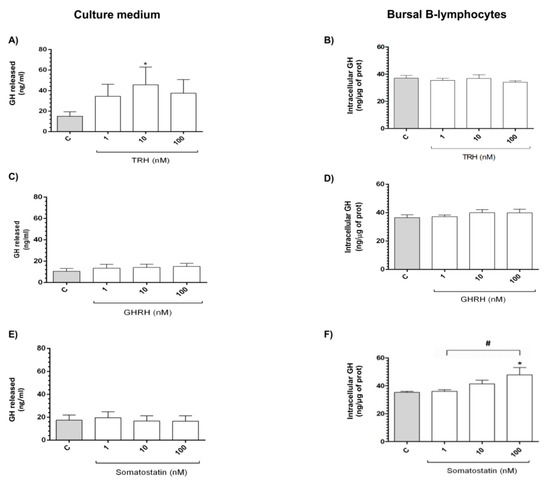 TRH, GHRH, and SST effects upon GH synthesis and release in BBLs. Intracellular (B,D,F) and released (A,C,E) GH were determined by ELISA in B-bursal lymphocyte cultures in response to TRH, GHRH, and SST (1, 10, and 100 nM). Each bar represents means ± SEM. Data was obtained from seven independent experiments for cellular fraction and five independent experiments for culture media. Asterisks represent significant differences between control group (* p < 0.05) using one-way ANOVA for multiple comparisons and non-parametric Dunn´s post-hoc test for TRH and parametric Šidák post-hoc test for SST. Number sign represents the differences between experimental groups (# p < 0.05).