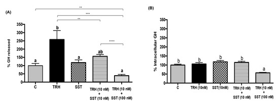 Inhibitory effect of SST upon TRH-induced GH release in BBLs. GH was determined by ELISA in either culture media (A) or intracellular content (B) in response to incubation with 10 nM TRH, 10 nM SST, or the combination of TRH (10 nM) with SST (10 or 100 nM), after one-hour treatment. Each bar represents mean ± SEM. The data were obtained from three independent experiments and expressed as percentage (%). Group with different letters are significantly different as compared with control conditions. We used one-way ANOVA with multiple comparison test and Tukey as post-hoc test, (p < 0.001). Asterisks indicate differences between experimental groups as determined by unpaired t test. ** p < 0.01; *** p < 0.001; **** p < 0.0001.