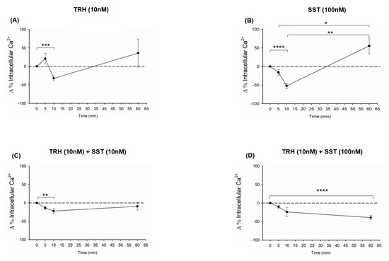 TRH and SST effects upon intracellular Ca2+ levels. Intracellular calcium concentrations were measured in B-bursal cells over 5, 10, and 60 min., with the following treatments: 10 nM TRH (A), 100 nM SST (B), or the combination of both hormones [TRH 10 nM + SST 10 nM (C) and TRH 10 nM + SST 100 nM (D)]. RPMI 1640 medium was used as control (0 min.). Each point represents mean ± SEM. Data was obtained from four independent experiments for the cases of TRH or SST; on the other hand, three independent experiments were used in the combination of TRH + SST. Units are expressed as a delta proportion (Δ%) in relation to the control. Asterisks indicate differences between experimental groups, as determined by paired t test. * p < 0.05; ** p < 0.01; *** p < 0.001; **** p < 0.0001.