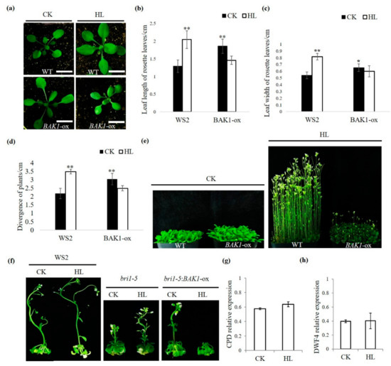 Overexpression of brassinosteroid-insensitive 1 (BRI1) associated receptor kinase 1 (BAK1) suppresses high light-promoted plant growth independent on the brassinosteroid-insensitive (BR) signaling pathway. (a) Representative Arabidopsis plants grown under different growth conditions. Seedlings were grown in soil for 8 days under 100 μmol·m−2s−1 light intensity and then subjected to high light treatment (400 μmol·m−2s−1) for 10 days. CK, control light; HL, high light. Scale bars = 1 cm. The experiments were repeated three times with similar results. (b–d) Quantitative analyses of leaf length, leaf width, and divergence of plants were made on at least 10 representative plants. Data represent means and standard errors. The asterisks indicate significant differences compared to the wild type plants in CK condition (*p < 0.05, **p < 0.01 by the Student’s t-test). The experiments were repeated three times. (e) Seedlings were grown for 8 days under 100 μmol·m−2s−1 light intensity and then subjected to high light treatment (400 μmol·m−2s−1) for 15 days. The experiments were repeated three times with similar results. (f) Representative plants grown on 1/2 MS medium under different growth conditions. Seedlings were grown for 8 days on 1/2 MS medium and then subjected to high light treatment (400 μmol·m−2s−1). The experiments were repeated three times with similar results. (g,h) Relative expression of CPD and DWF4 genes in bri1-5:BAK1-ox plants grown under different conditions analyzed by qRT-PCR. The ACTIN gene was used as the reference gene. Error bars represent SD (n = 3).