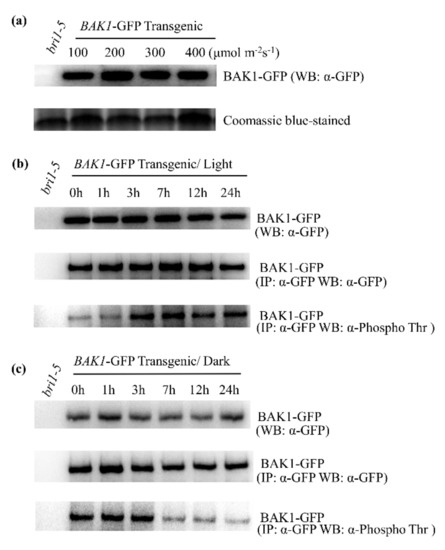 The role of BAK1 in BR signaling has been well studied, in which the phosphorylation of BAK1 is essential for the activation of the BAK1 kinase [21]. Significantly, the BAK1 phosphorylation level is dramatically enhanced after plant perception of the BR elicitor [21]. To determine the role of BAK1 in plant response to high light, the phosphorylation level of BAK1 was examined upon high light treatment. To this end, we first determined whether light has any effect on the BAK1 protein stability. We extracted total protein from bri1-5:BAK1-GFP-ox plants treated with light with different intensities and analyzed BAK1 protein level by Western blotting analysis using the anti-GFP antibody. We found light does not have a significant impact on the BAK1 protein level (Figure 2a). We then determined possible phosphorylation alternation of BAK1 kinase in response to high light treatment. Ten-day-old bri1-5:BAK1-ox seedlings grown in 100 μmol·m−2s−1 light intensity were treated with 400 μmol·m−2s−1 high light and leaf tissues were collected at 0, 1, 3, 7, 12, and 24 h after treatment. The seedlings were then placed back in the dark, and leaf tissues were collected at 0, 1, 3, 7, 12, and 24 h afterward. The BAK1 protein was immunoprecipitation-purified by the anti-GFP antibody and protein A agarose beads from total protein extracted from leaf tissues. The immunoprecipitates were then separated on SDS-PAGE and detected with anti-GFP and anti-phosphothreonine antibody, respectively. Consistent with the result of the light intensity experiment, high light treatment had no significant effect on BAK1 protein accumulation (Figure 2b). However, upon strong light treatment, a gradually increased BAK1 phosphorylation signal was detected by the anti-phosphothreonine antibody within 3 h, suggesting high light stimulates the phosphorylation of BAK1 protein (Figure 2b). Consistent with this result of light-dependent phosphorylation of BAK1, when light treatment was terminated by placing plants in the dark, the phosphorylation of BAK1 was dramatically reduced within 7 h, even though the dark treatment did not alter the expression level of BAK1 protein (Figure 2c). Taken together, our results suggest that high light enhances the phosphorylation of BAK1.