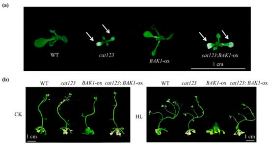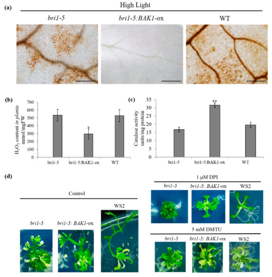 BAK1 has also been shown to be involved in some light-mediated physiological processes, in which BAK1 and its homologs (termed somatic embryogenesis receptor kinase (SERKs); BAK is also called SERK3) usually possess a functional redundancy [23,24,25]. Previous studies have shown that BAK1 and its closest homolog BKK1 double null mutant bak1 bkk1 displays a BR-independent but light-dependent cell-death phenotype, suggesting BAK1 plays distinct roles in BR signaling and light-dependent cell-death signaling. Significantly, like many cell-death mutants, there is a significant accumulation of H2O2 and callose deposition in bak1 bkk1, accompanied by cell death [26,27]. In this study, we investigated the role of BAK1 in the high light-mediated plant growth. We found that overexpression BAK1 can suppress plant growth promoted by high light, presumably via attenuation of the cellular H2O2 level by phosphorylation of the scavenging catalases.