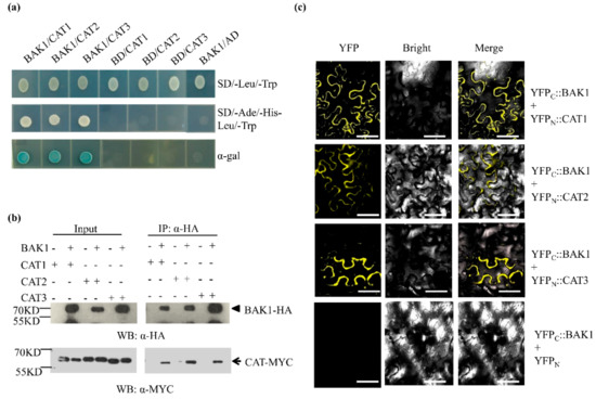 We sought to explore the molecular factors associated with BAK1 by the affinity purification of the BAK1-containing protein complex in plant cells, followed by the LC-MS/MS analysis. To this end, total soluble proteins prepared from the 2-week-old seedlings of BAK1-GFP transgenic plants were incubated with the anti-GFP antibody and protein-A beads, and proteins eluted from the beads were separated by SDS-PAGE, followed by LC-MS/MS analysis to determine the identity of the BAK1-associated proteins. We found At1g20620 (CAT3) protein presenting in the BAK1 immunoprecipitated complex, suggesting that CAT3 is a candidate of BAK1-interacting protein in vivo. Since the Arabidopsis genome contains three catalase genes, namely CAT1 (At1g20630), CAT2 (At4g35090), and CAT3 (At1g20620) [31], to verify the interaction of BAK1 with catalases, three catalase isoforms were used as prey for yeast two-hybrid assays. As shown in Figure 4a, when the BAK1 bait was co-transformed with the CAT1, CAT2, and CAT3 preys individually, the transformed yeast cells grew well on the selection medium (SD/-Ade/-His/-Leu/-Trp) and exhibited the X-galactosidase (X-gal) activity, indicating BAK1 interacts with CAT1, CAT2, and CAT3.