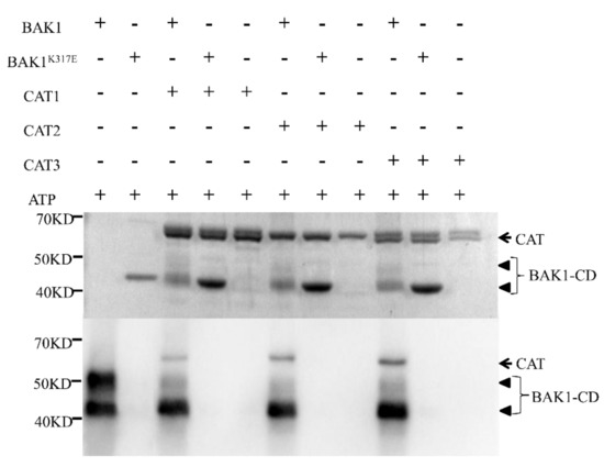 Protein purification in vitro was used with Escherichia coli Amino-terminal FLAG® Expression Kit (Sigma, Saint Louis, MO, USA). Generation of Flag-BAK1-CD (CD, cytoplasmic domain) and Flag-BAK1K317E-CD is described as previously [21]. The coding sequence of each CAT was amplified from the right construct pGADT7:CAT, and cloned via Hind III and Kpn I sites into the pFLAG-MAC vector. The constructed vectors were transformed into BL21 and induced by IPTG for protein expression. After harvesting cells, the cells were sonicated for breaking. The supernatant solution was collected by centrifugation. Anti-flag M2 affinity gel (Sigma, Saint Louis, MO, USA) was added to the supernatant to purify the protein. Elution buffer (50 mM Tris-HCl, pH 7.5, 150 mM NaCl, 0.3 mg/mL Flag peptides, 0.1% Triton X-100) was used for obtaining the target protein. The corresponding target protein was reacted in the kinase buffer (50 mM HEPES-KOH, PH 7.4, 10 mM MgCl2, 10 mM MnCl2, 1 mM DTT and 0.2 mM unlabeled ATP) for 1 h. Reactions were terminated by adding the same volume 2× SDS loading buffer. The primer sequences and restriction sites are listed in Table S1.