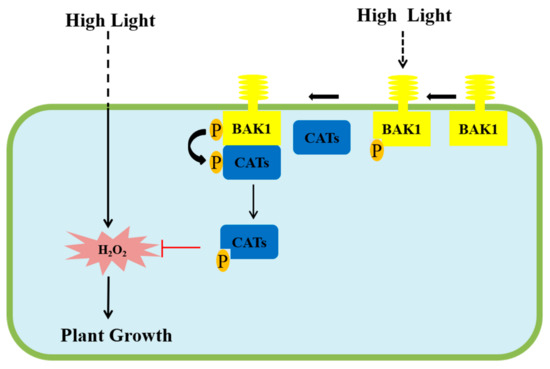 In summary, we propose a simplified model based on our research results (Figure 7): In the transgenic Arabidopsis overexpressing BAK1, high light can induce the phosphorylation of the over-accumulated BAK1 kinase caused by the expression of the BAK1 gene, which in turn interacts with and phosphorylates catalases CAT1/2/3, resulting in activation of CAT1/2/3. The much-activated catalases act in scavenging H2O2, thereby leading to the arrest of high light-promoted growth and development. In the wildtype Arabidopsis with BAK1 natural expression, high light inducing H2O2 accumulation properly is controlled by light-activated BAK1 to maintain the H2O2 homeostasis, which will eventually lead to the promotion of growth and development of Arabidopsis plants.
