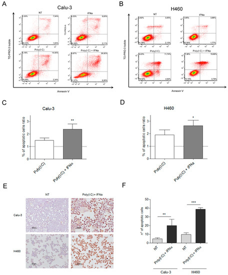 Two human lung cancer cell lines that express TLR3 (Figure S1)—Calu-3 (adenocarcinoma) and H460 (large cell carcinoma)—were treated with a synthetic TLR3 agonist, Poly(I:C), to mimic the effects of viral dsRNAs in vitro. Poly(I:C) was combined with IFN type I that is reportedly necessary but not sufficient to activate the apoptotic pathway in melanoma and breast cancer cells [15,16]. Cytofluorimetric annexin V assay showed that around 30% of Calu-3 and of H460 cells die after 48 h incubation with 100 μg/mL Poly(I:C), in combination with 100 U/mL INFα (Figure 1A–D). TUNEL assay confirmed apoptosis in 20% and 40% of Poly(I:C)/INFα-treated Calu-3 and H460 cancer cells, respectively, compared with untreated control cells (Figure 1E,F).