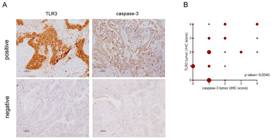 IHC performed on FFPE NSCLC specimens showed TLR3 and caspase-3 expression in tumor cells (Figure 2A). TLR3 and caspase-3 expression were scored as described in Materials and Methods section. Considering all cases, no correlation emerged between TLR3 and caspase-3 expression in tumor cells; whereas, by considering only lung adenocarcinoma, a significant direct correlation was observed (Figure 2B; p = 0.0340, Pearson test; n = 33). Indeed, cases with an elevated percentage of tumor cells expressing caspase-3 showed concurrently a high percentage of tumor cells expressing TLR3 (>50% of total tumor cells; score 2, 3, 4); conversely, most of the cases (11/13 cases, 85%) with TLR3 low expression on tumor cells showed a concomitant low expression of caspase-3 on tumor cells (≤25% of total tumor cells; score 0, 1).
