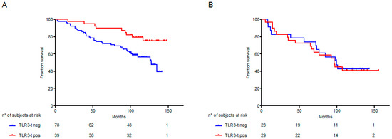 Kaplan–Meier plots of Overall Survival (OS) according to NSCLC histotype and TLR3 immunohistochemistry expression. The relationship between TLR3 expression and prognosis, according to NSCLC histotype, was examined in a cohort of NSCLC specimens, collected at Fondazione IRCCS Istituto Nazionale Tumori Milan [13]. NSCLC cases were considered positive for TLR3 expression (TLR3-t) with a percentage of positive tumor cells >50%. (A) Kaplan–Meier plots of OS of 117 adenocarcinoma NSCLC patients stratified according to TLR3-t immunohistochemistry expression; (B) Kaplan–Meier plots of OS of 52 squamous NSCLC patients stratified according to TLR3-t immunohistochemistry expression; Red line: cases positive for TLR3-t expression; blue line: cases negative for TLR3-t expression.