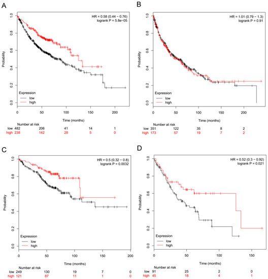 - Gyorffy, B.; Lanczky, A.; Eklund, A.C.; Denkert, C.; Budczies, J.; Li, Q.; Szallasi, Z. An online survival analysis tool to rapidly assess the effect of 22,277 genes on breast cancer prognosis using microarray data of 1809 patients. Breast Cancer Res. Treat. 2010, 123, 725–731. [Google Scholar] [CrossRef] [PubMed]