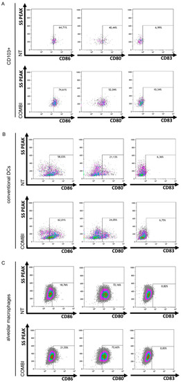 The total number of activated CD103+ CD86+ and of CD103+ CD80+ cell subsets rose 10% and 12% by FACS, respectively, in the immune cells co-cultured with Poly(I:C)/INFα-treated-H460 cancer cells versus untreated H460 cells (Figure 5A). CD103+ CD83+ cells increased by 4% (Figure 5A). A similar increase in the CD103+ fractions, which were positive for CD80, CD83 and CD86 activation markers, was observed in Calu-3 cells (Figure S7). Higher expression of these markers, albeit to a lesser extent, was also observed in conventional dendritic cells (CD11b+ CD11c+ CD103− DCs) (Figure 5B) (+4% CD86 and +3% CD80), but CD86, CD83, and CD80 were not upregulated in alveolar macrophages (Figure 5C).