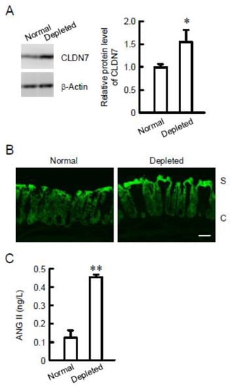 Effect of NaCl depletion on colonic claudin-7 (CLDN7) expression and serum angiotensin II (ANGII) concentration. (A) The distal colon was isolated from the mice fed with normal and NaCl-depleted diets. Cytoplasmic extracts including membrane and cytoplasmic proteins of colon were immunoblotted with anti-CLDN7 or β-actin antibody. The content of CLDN7 was represented relative to the values of normal. (B) The segments of distal colon were isolated from the mice fed with normal and NaCl-depleted diets. They were incubated with anti-CLDN7 antibody (green). S and C represent surface and crypt epithelia, respectively. The scale bar represents 50 µm. (C) Serum ANGII concentrations in the mice fed with normal and NaCl-depleted diets were measured. n = 3. ** p < 0.01 and * p < 0.05 significantly different from normal.