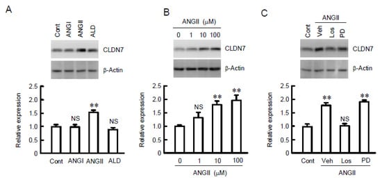 Increase in CLDN7 expression by ANGII in MCE301 cells. (A) Cells were treated with 10 µM ANGI, 10 µM ANGII, or 50 nM aldosterone (ALD) for 24 h. Control cells (Cont) were not treated with these chemicals. Cytoplasmic extracts including membrane and cytoplasmic proteins were immunoblotted with anti-CLDN7 or β-actin antibody. The content of CLDN7 was represented relative to the values in control. (B) Cells were treated with ANGII for 24 h in the concentration indicated. Cytoplasmic extracts were immunoblotted with anti-CLDN7 or β-actin antibody. The content of CLDN7 was represented relative to the values in 0 µM. (C) Cells were treated with 10 µM ANGII for 24 h in the presence and absence of 10 µM losartan (Los) or 10 µM PD123319 (PD). Cytoplasmic extracts were immunoblotted with anti-CLDN7 or β-actin antibody. The content of CLDN7 was represented relative to the values in control. n = 4. ** p < 0.01 significantly different from Cont or 0 µM. NS p > 0.05 not significantly different.
