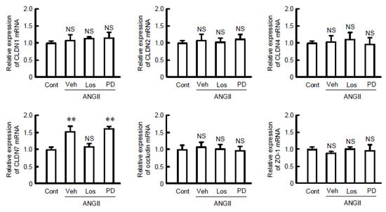 Effect of ANGII and receptor antagonists on expression of tight junctional proteins. Cells were treated with 10 µM ANGII for 6 h in the presence and absence of 10 µM losartan (Los) or 10 µM PD123319 (PD). After isolation of total RNA, RT-PCR was performed using primer pairs of mouse CLDN1, CLDN2, CLDN4, CLDN7, occludin, zonula occludens (ZO)-1, and β-actin. The contents of these transporters were represented relative to the values of β-actin. n = 3–4. ** p < 0.01 significantly different from control (Cont). NS p > 0.05 not significantly different.
