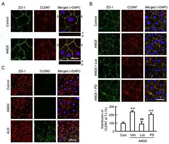 Effects of ANGII on the intracellular localization of CLDN7. (A) Cells were treated in the presence and absence of 10 µM ANGII for 24 h. The cells were stained with CLDN7 (red) and ZO-1 (green). Merged images with 4′,6-diamidino-2-phenylindole (DAPI) staining of the nuclei are shown on the right. The lower images represent the xz section. A and B indicate the apical and basal sides, respectively. (B) Cells were treated with 10 µM ANGII for 24 h in the presence and absence of 10 µM losartan (Los) or 10 µM PD123319 (PD). The cells were stained with CLDN7 (red) and ZO-1 (green). Merged images with DAPI staining of the nuclei are shown on the right. The distribution levels of CLDN1 in the TJ are shown as percentage of control (Cont). (C) Cells were treated with 10 µM ANGII or 50 nM aldosterone (ALD) for 24 h. The cells were stained with CLDN2 (green) and ZO-1 (red). The scale bar represents 20 µm. n = 4–6. ** p < 0.01 significantly different from Cont. ## p < 0.01 significantly different from vehicle (Veh).