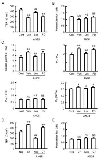 Effects of ANGII and receptor antagonists on paracellular permeability. (A–C) Cells were cultured on transwell inserts for 21 days. Then the cells were incubated with 10 µM ANGII for 24 h in the presence and absence of 10 µM losartan (Los) or 10 µM PD123319 (PD). (A) Transepithelial electrical resistance (TER) was measured with volt ohmmeter. (B) Lucifer yellow (LY) was applied to the apical compartment. The buffer in the basal compartment was collected after 1 h, and fluorescence intensity was measured. (C) Transwell inserts were mounted on the Ussing chamber. PCl/PNa was estimated by dilution potential experiments. (D,E) Cells were transfected with negative (Neg) or CLDN7 siRNA (C7). Then the cells were incubated in the absence and presence of 10 µM ANGII for 24 h, followed by measurement of TER and LY flux. n = 4. ** p < 0.01 and * p < 0.05 significantly different from control. ## p < 0.01 and # p < 0.05 significantly different from vehicle (Veh) or negative siRNA (Neg). NS p > 0.05 not significantly different from control (Cont) or Neg.