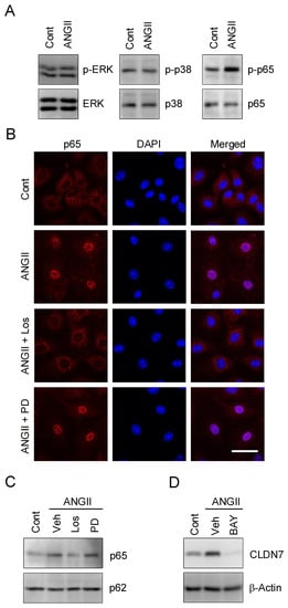Increase in nuclear localization of NF-κB by ANGII was observed. So far, ANGII has been reported to activate intracellular signaling pathways including extracellular-signal-regulated kinase (ERK), p38, and NF-κB []. ANGII increased phosphorylated p65 (p-p65) subunit of NF-κB without affecting total amount of p65 (Figure 6A). In addition, the levels of phosphorylated-ERK (p-ERK), ERK, phosphorylated-p38 (p-p38), and p38 were unchanged by ANGII. Immunofluorescence measurement and nuclear extraction assay indicated that ANGII increased the nuclear localization of p65, which was inhibited by losartan, but not by PD123319 (Figure 6B,C). Nucleoporin p62 served as an internal control of the nuclei. These results indicate that the activation of NF-κB may be involved in the elevation of CLDN7 by ANGII. Therefore, we investigated the effect of BAY 11-7082 (BAY), an NF-kB inhibitor, on CLDN7 expression. The elevation of CLDN7 protein was inhibited by BAY (Figure 6D). These results indicate that ANGII may elevate the expression of CLDN7 mediated through the activation of NF-κB signaling.