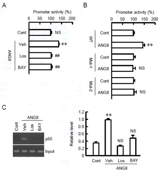 Binding of p65 to CLDN7 promoter by ANGII. (A) Promoter luciferase constructs of wild-type (WT) CLDN7 were co-transfected with pRL-TK vector into the cells. After 40 h of transfection, the cells were incubated in the presence and absence of 10 µM ANGII, 10 µM losartan (Los), and 10 µM BAY for additional 8 h. Control cells (Cont) were not treated with these drugs. Vehicle (Veh) was treated with dimethylsulfoxide. The relative promoter activity was represented as the values of control (Cont). (B) Promoter luciferase constructs of WT, mutant-1 (Mut-1), and mutant-2 (Mut-2) were co-transfected with pRL-TK vector into the cells. After 40 h of transfection, the cells were incubated in the presence and absence of 10 µM ANGII for additional 8 h. The relative promoter activity was represented as the values of control. (C) Nuclear proteins were prepared from the cells treated with 10 µM ANGII for 1 h in the presence and absence of 10 µM losartan (Los) or 10 µM BAY. After immunoprecipitation of genomic DNA by anti-p65 antibody, semi-quantitative PCR was performed using the primer pairs amplifying the p65 binding sites (-648/-635 and -616/-603) of CLDN7 promoter. Input chromatin was used for loading control. ** p < 0.01 significantly different from Cont. NS p > 0.05 not significantly different from Cont.