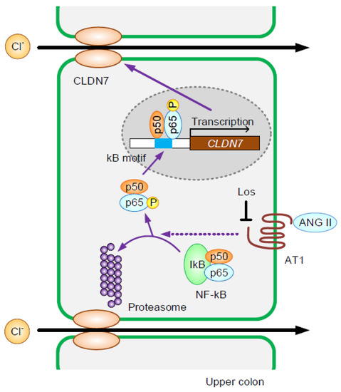 A putative model of ANGII-induced elevation of CLDN7 expression in the colon. ANGII increases the phosphorylation and nuclear localization of p65 subunit of NF-κB mediated through the activation of AT1. The p65 subunit binds to the promoter region of CLDN7 and increases the expression of CLDN7, resulting in the elevation of Cl− absorption in the colon.