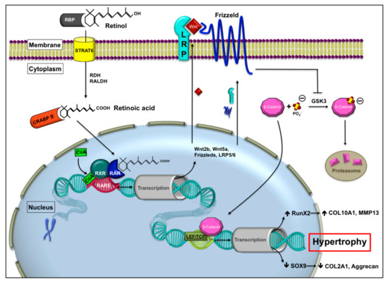 - Yasuhara, R.; Yuasa, T.; Williams, J.A.; Byers, S.W.; Shah, S.; Pacifici, M.; Enomoto-Iwamoto, M. Wnt/beta-catenin and retinoic acid receptor signaling pathways interact to regulate chondrocyte function and matrix turnover. J. Biol. Chem. 2010, 285, 317–327. [Google Scholar] [CrossRef] [PubMed]