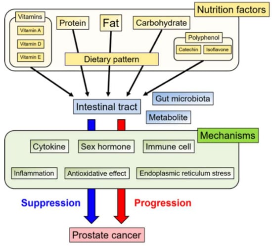 Schema of various nutrition factors and mechanisms involved in the progression or suppression of prostate cancer via the intestinal tract.