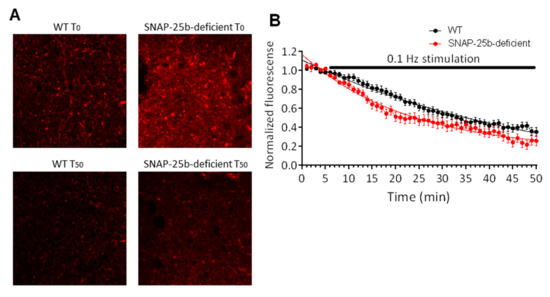 Presynaptic vesicular release from Schaffer collateral terminals in one month old SNAP-25b-deficient mice. (A) Representative fluorescent images of hippocampal field CA1 stratum radiatum in slices from WT and SNAP-25b-deficient mice prior to synaptic stimulation (T0) and after 50 min of 2Hz stimulation (T50). Bright puncta are presynaptic Schaffer collateral terminals. (B) Fluorescence decay of vesicular dye FM1-43 from Schaffer collateral-CA1 presynaptic boutons elicited by 0.1 Hz stimulation (black bar). SNAP-25b-deficient mice (filled circles, n = 20 puncta from 4 slices) showed a significantly faster rate of FM1-43 decay compared to wild type mice (open circles, n = 18 puncta from 6 slices). Each point is mean ± SEM of ‘n’ puncta.