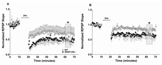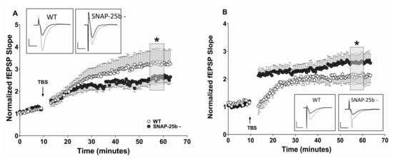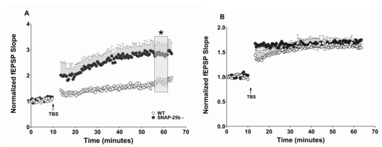 - Irfan, M.; Zurawski, Z.; Hamm, H.E.; Bark, C.; Stanton, P.K. Disabling Gbetagamma-SNAP-25 interaction in gene-targeted mice results in enhancement of long-term potentiation at Schaffer collateral-CA1 synapses in the hippocampus. Neuroreport 2019, 30, 695–699. [Google Scholar] [CrossRef]