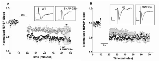 In LTP and LTD experiments, comparison of fEPSP slopes normalized to baseline slopes from slices from wildtype and SNAP-25b-deficient mice were analyzed by two-tailed Student’s t-test for unpaired data. The null hypothesis was that true mean normalized slope between wildtype and SNAP-25b-deficient slices was equal to zero, the alternative hypothesis was that the true mean difference was not equal to zero. One-way ANOVA with repeated measures was used to determine differences between WT and SNAP-25b-deficient mice for all behavioral testing, followed by Bonferroni correction for multiple comparisons (Prism, GraphPad Software, San Diego, CA, USA). All data points are mean ± SEM of n slices, recording from 1–2 slices per mouse. Significance level was pre-set to p < 0.05.