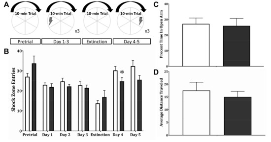 The active place avoidance task used was previously described by Burghardt et al. [31]. In this paradigm, mice are placed on a circular rotating platform that continuously turns clockwise at a speed of 1 rpm. Over several days and multiple trials (Figure 3a), mice (n = 12–17) learn to identify the 60° shock zone guided by spatial markers on the walls surrounding the apparatus. Entrance into the shock zone triggered a brief foot-shock (500 ms, 60 Hz, 0.2 mA) with an inter-shock interval of 1.5s that would cease upon leaving the shock zone. The middle point of the animal was used as the reference point to determine the position of a mouse and recorded using AnyMaze behavioral analysis software (Stoelting Co., Wood Dale, IL, USA) Using the same software, the number of shock-zone entries was measured, where a decrease in shock-zone entries indicates learning. During the initial pre-training trial (10 min) when the shock was turned off, mice were allowed to habituate to the apparatus and showed no preference for any area of the platform. Subsequently, the shock was turned on, and the mice completed three training sessions (10 min each) per day for three days, followed by an extinction trial (10 min) on the next day when the shock was turned off and the animals were allowed to ambulate freely into the zone previously associated with the shock. After extinction, a conflict variant task was performed in order to test cognitive flexibility. The shock zone was moved 180° from where the original shock zone was placed and three conflict-training sessions (10 min each) were conducted per day for two days. Mice had to avoid the new shock zone which requires cognitive flexibility and is represented in this task by the simultaneous suppression of the learned condition response of avoiding the original shock zone and learning the new association of a foot-shock with a different zone.