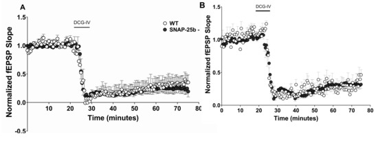 In mGluRII cLTD, lack of SNAP-25b did not alter the amplitude of mGluRII cLTD in either one (Figure 7A) or four month old (Figure 7B) SNAP-25b-deficient mice compared to WT littermate controls, indicating that molecular mechanisms downstream of synaptic stimulation underlie the induction of mGluRII-dependent presynaptic LTD. Moreover, they are not differentially regulated by the two isoforms of SNAP-25.