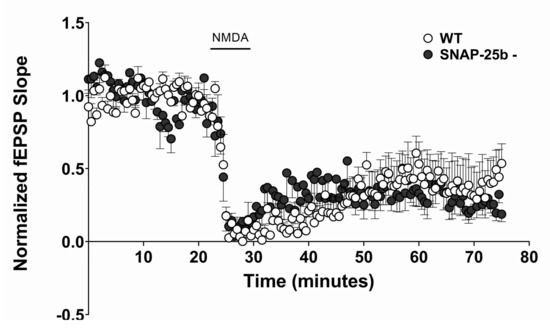 Differences observed in synaptic plasticity in one month old SNAP-25b-deficient mice of both sexes were not due to alterations in NMDAR response to glutamate. The presence of SNAP-25a in mutant mice (filled circles, n = 5) did not alter the extracellular amplitude of NMDA-induced cLTD (20 µM; solid bar = 5 mins at 2mL/min) compared to WT littermates (open circles, n = 7) at Schaffer collateral-CA1 synapses. Each point is normalized to averaged baseline and is mean ± SEM of n slices.