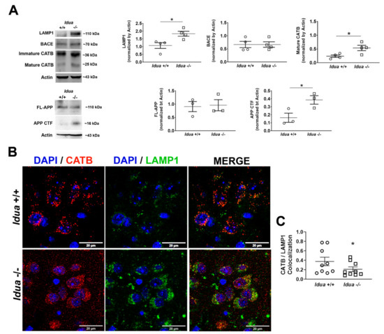 As shown in Figure 1B,C, a reduced colocalization between CATB and LAMP1 was observed in brain cortex of 6-month-old Idua -/- mice, suggestive of permeabilization of the lysosomal membrane with consequent leakage of CATB to the cytoplasm.