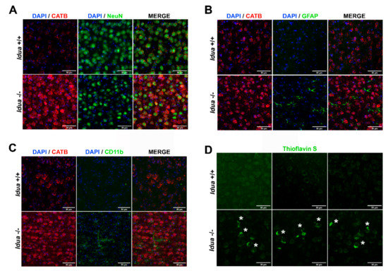 Increased levels of CATB, neuroinflammation, and Thioflavin S-positive aggregates in the brain cortex from Idua -/- mice. Representative images of confocal laser scanning microscopy of 6-month-old Idua +/+ and Idua -/- brain cortex immunostained for CATB and neuronal marker NeuN (A), CATB and astrocyte marker GFAP (B), and CATB and activated microglia marker CD11b (C). DAPI (4,6-diamidino-2-phenylindole dihydro-chloride) was used as a nuclear counterstain. (D) Thioflavin-S-positive protein aggregates suggestive of amyloid plaque deposition in 6-month-old Idua -/- brain cortex are indicated by white asterisks.