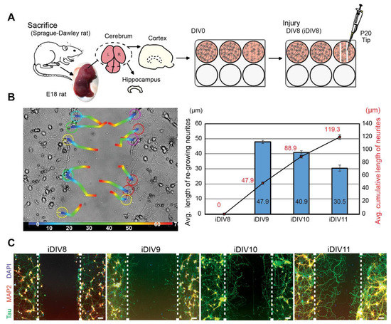 Neurite re-growth of primary cortical neurons in an in vitro traumatic brain injury (TBI) model. (A) Schematic flow chart of experimental design. (B) Trajectory of single neurite re-growth was tracked from 0 h (blue) to 72 h (red) after injury using tracking function of AxioVision software (left). Quantitative results of average length of re-growing neurite (blue bars) and average cumulative length (line graph) are shown from iDIV8 to iDIV11 (right). (n = 3, track 12 neurites/experiment.) (C) Cortical neurons were fixed on iDIV8 to iDIV11 and were subjected to immunofluorescence staining with anti-Tau (green, axonal marker), anti-MAP2 (red, dendritic marker) antibodies, and DAPI (blue, nuclei). Merged images are shown. White dashed lines indicate the borders of the injured gap. Scale bar, 50 µm.