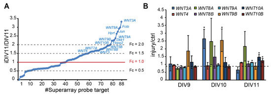 To identify candidate regeneration-associated genes (RAGs) during regeneration of injured cortical neurons, our previous RNA-seq data suggest a subset of WNT genes as candidate RAGs (data not shown), in addition to pathway-focused superarray analysis of 88 WNTs and WNT target genes, given that our previous data has suggested that WNT signaling is implicated in neuronal regeneration (data not shown). Superarray analysis showed that 48 genes (54.5%) were up-regulated. Among them, WNT3, WNT3A, WNT4, WNT5A, WNT5B, WNT6, WNT7A, WNT8A, WNT8B, WNT9A, WNT9B, and WNT10B expression were up-regulated (fold change > 1.5) during regeneration (Figure 2A). Increased expression of WNT3A, WNT8A, and WNT9B on iDIV10 compared to DIV10 was validated by qPCR, with the expression of WNT3A and WNT9B showing significant increase (Figure 2B). Although the fold increase of WNT genes is not high, local concentration of secreted WNTs in the brain tissue under tight control of blood–brain barrier (BBB) may be sufficient to trigger cellular response.