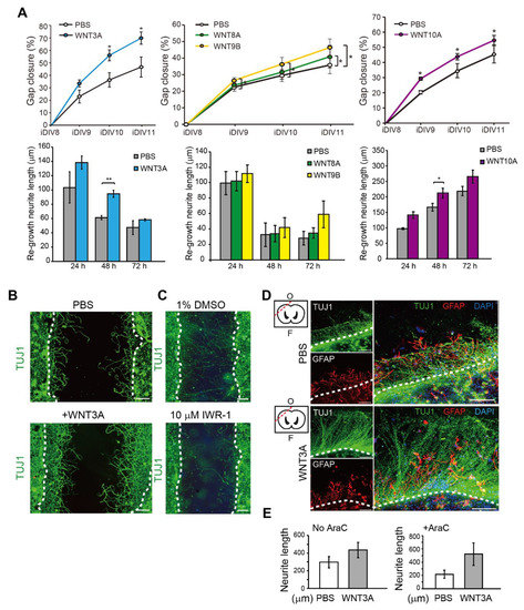 WNT signaling is an evolutionarily conserved pathway that regulates axis specification of the neural plate, neural tube morphogenesis, dendrite and axon development, and synaptic plasticity [5,6,7]. Aberrant WNT signaling has previously been implicated in Alzheimer’s disease and Parkinson’s disease [8,9,10]. In this study, we determined the expression of a number of WNT genes during regeneration of injured cortical neurons. In vitro and in vivo studies examined the regenerative potential of WNT3A upon traumatic brain injury.