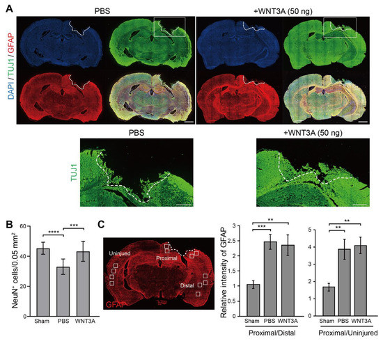 Eight-to-ten-week-old C57BL/6J male mice were purchased from National Laboratory Animal Center, Taiwan, and subjected to TBI by using the pneumatic CCI equipment (Electric Cortical Contusion Impactor, Custom Design & Fabrication, Inc., Sandston, VA, USA). Upon anesthesia, craniectomy was then performed to remove the skull in a shape of 3-mm-diameter circle over the left frontoparietal cortex (−0.5 mm anteroposterior and +0.5 mm mediolateral to bregma). After exposing the dura matter, the brain was impacted by pneumatically operated CCI device at the velocity of 3 m/s, reaching 1 mm in depth, affecting a 2-mm-diameter circular area, and with 500-ms dwell time to generate mild TBI [13]. After CCI-induced brain injury and suturing, PBS or 50 ng WNT3A was intranasally delivered to mice daily for consecutively four days. On 4 dpi, the TBI mice were anesthetized and perfused with saline and 4% paraformaldehyde. The brain tissues were then isolated, immersed in 10%, 15%, and 20% sucrose followed by embedded in Shandon Cryomatrix embedding resin (Thermo Scientific, Waltham, MA, USA) and sliced into 10-μm sections by cryostat microtome (Leica CM3050 S, Leica Biosystems, Baffalo Grove, IL, USA). The cryosections were incubated in antigen retrieval solution at 70 °C for 20 min and then incubated in 1% BSA for 2 h. After BSA blocking, the cryosections were subjected to immunofluorescence staining with anti-TUJ1 and anti-GFAP antibodies, followed by incubating with fluorescence-conjugated secondary antibodies. DAPI was used to stain the nuclei at room temperature for 10 min. Finally, the cryosections were mounted by using 90% glycerol. Fluorescence images of brain cryosections were imaged by Zeiss Confocal LSM800 and analyzed by Zeiss ZEN 2.3 lite Imaging Software (Zeiss, White Plains, NY, USA). The intensity of GFAP around the impact site (indicated as “proximal”), at the ipsilateral hemisphere distal to the impact site (indicated as “distal”), and at the contralateral uninjured hemisphere (indicated as “uninjured”), was quantified separately by calculating the average GFAP intensity of 4 defined squared region of interest (ROI) in each brain region. Relative intensity of GFAP was defined as the average intensity of proximal regions divided by the average intensity of distal or uninjured regions (Figure 4C, left panel). The number of NeuN+ cells was defined as the average NeuN+ cells counted in the 4 squared ROI at the proximal regions around the impact site. The area of each ROI is 0.05 mm2.