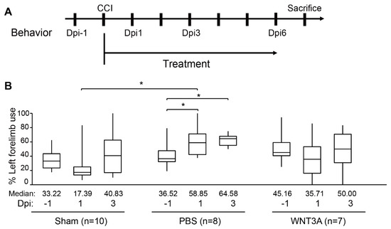 Intranasal administration of WNT3A preserves motor function of CCI mice. (A) Timeline of the experimental design for cylinder test. Dpi, day post injury. (B) The box plots of mice forelimb placing capacity in the left (ipsilateral unimpaired) forelimb before and after CCI for sham control (n = 10), PBS control (n = 8), and WNT3A treatment (n = 7) (−1 to 3 dpi). The boundaries of the boxes closest and farthest to the zero point indicate the 25th and the 75th percentiles, respectively. The black bars within the boxes mark the median and the values are presented below the plot. The limit of whiskers above and below the boxes mark the maximal and minimal values respectively. * p ≤ 0.05, analyzed by Two-way ANOVA followed by Tukey’s test.