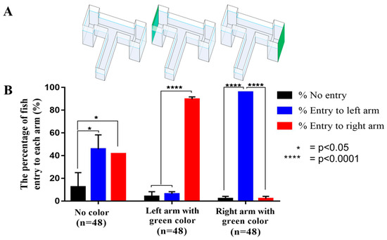 The assessment of individual fish with color cue option in the habituation phase. (A) Three T-maze designs. (B) The comparison of percentage fish entry to each arm in three different T-maze configurations. Based on the results, we decided to use the T-maze apparatus with a green cue at the right arm and electric shock at the left arm (punishment chamber). The data expressed as the means ± SEM. The data were analyzed by one-way ANOVA and followed with the Tukey–HSD test (* p < 0.05, **** p < 0.0001, n = 48).