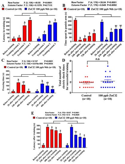 The assessment of toxicity of ZnCl2 exposure on learning and memory performances in the T-maze test. (A) The latency (s) of control and ZnCl2-incubated fish to swim into the punishment chamber for each training session. (B) The time spent in the punishment chamber (s) of control and ZnCl2-incubated fish at different time points (before and after training). (C) The freezing time (s) of control and ZnCl2-incubated fish at different time points before and after training. (D) The total number of electric shocks given for control and ZnCl2-incubated fish. (E) The memory retention latency (s) of control and ZnCl2-incubated fish at different time points after training. (F) The typical swim locomotion trajectories for control fish before (left panel) and after training (middle panel), and for ZnCl2 exposed fish after training (right panel). The data are expressed as means ± SEM. The data were analyzed by two-way ANOVA and followed with the Tukey–HSD test (** p < 0.01, n = 18). Different letters (a, b, c) on the error bars represent significant differences (p < 0.05).