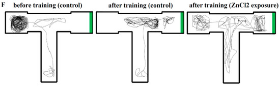 In a previous study, we discovered that low concentrations of ZnCl2 could reduce the brain acetylcholine content and induce memory loss in zebrafish by using a passive avoidance shuttle box test [25]. However, in the passive avoidance test, there is a tendency that the zebrafish will swim in the dark area as an innate response (usually less than 5 s). Therefore, the passive avoidance test is not suitable to test learning performance in zebrafish. In this consideration, we aimed to use this modified T-maze to validate the learning and memory performances of ZnCl2-incubated fish. After four days of ZnCl2 exposure at 100 ppb, we used the modified T-maze to perform learning and memory tests. As shown in Figure 4A, the latency in training of the treatment group was significantly increased after training session 1 for both control and ZnCl2-incubated fish, but there were no significant differences in each training session in comparison with the control group (ANOVA F1136 = 0.1376, p = 0.7113). In addition, the total number of electric shocks of ZnCl2-incubated fish was also similar to the control group, which indicated that ZnCl2 exposure had no effect on the learning performance for escaping dangerous objects (Figure 4D). Furthermore, we found that there were no significant differences between the control and ZnCl2-incubated fish on the learning performance of stimulation avoidance. However, we discovered that the ZnCl2-incubated fish spent more time in the punish arm after training (Figure 4B,F, right panel; ANOVA F1170 = 6.949, p = 0.0092) as well as displayed a shorter latency for swimming to the punish arm on testing session (Figure 4E; F1170 = 9.14, p = 0.0029). The locomotion trajectories for zebrafish before and after ZnCl2 exposure were demonstrated in Figure 4F. These results demonstrate that ZnCl2 at a low concentration affects the memory capacity of zebrafish. Taken together, this modified T-maze process was able to detect ZnCl2-induced memory impairment in zebrafish.