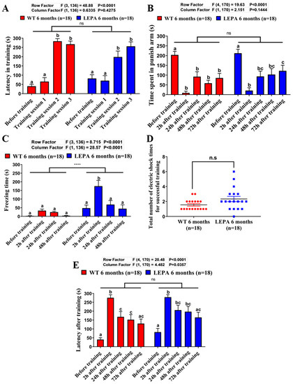 To evaluate the memory retention of zebrafish, the latency in the non-punishment area was measured. The results showed that zebrafish had the highest latency within 2 h after the training phase and the latency decreased over time after 24, 48, and 72 h. Furthermore, it was observed that the zebrafish could retain their memory for 48 h. After 72 h, there was no significant difference observed in comparison to the latency before training (Figure 5A). We also measured the time spent in the punishment arm (Figure 5B). Before training, all three groups showed the highest latency and the training phase was significantly reduced (F4204 = 31.97, p < 0.0001). Freezing time was considered as one of the parameters related to memory capability. In addition, freezing behavior has been associated with anxiety in zebrafish [27,28]. Figure 5C shows the average freezing time during the training phase in lepa KO fish. Longer freezing time in lepa KO zebrafish was observed to the WT zebrafish. (ANOVA F1136 = 28.57, p < 0.0001). We measured the latency in the testing phase and we found a slight difference between the lepa KO and WT fish after we tested with a two-way ANOVA test (with column factor F1170 = 4.482, p < 0.0035). However, after side-by-side comparison of the latency time in each different time points were conducted, we found that the short-term memory performance between lepa KO and control fish did not display any significant difference (Figure 5E).