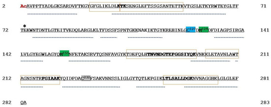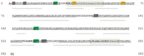 The results also confirmed that the N-terminal Met, as reported in the SwissProt database sequence (Acc. N. P21796), is missing in the mature protein and that the N-terminal Ala is acetylated (Figure 1, Figure S1, Table S1, molecular fragments 1, 2, and 3).