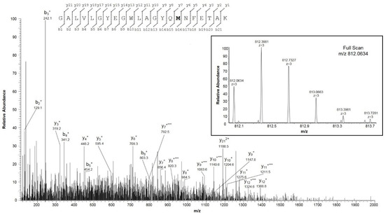 MS/MS spectrum of the triply charged molecular ion at m/z 812.0634 (calculated 812.0635) of the VDAC1 tryptic peptide from HAP1 cells containing methionine residue 155 in the oxidized form of methionine sulfoxide. The inset shows the full scan mass spectrum of molecular ion. Fragment ions originated from the neutral loss of methanesulfenic acid (CH2SOH, 64 Da) are indicated by three asterisks.