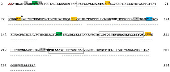 Analysis of the mass spectral data that were oriented to the determination of the oxidation state of cysteines showed that Cys232 was totally found in the carboxyamidomethylated form (Table S1, fragment 32), while Cys127 was exclusively detected in the oxidized form of sulfonic acid (Figure 2, Figure S2, and Table S2, fragments 1 and 2).