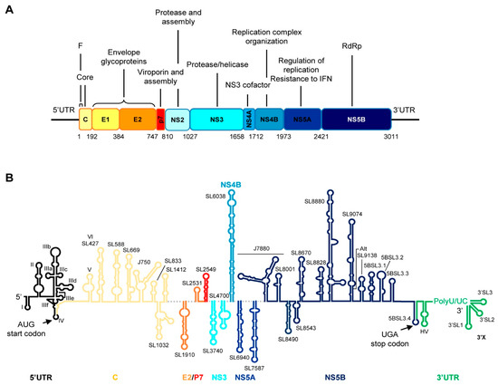 Genetic organization and structurally conserved RNA domains of the hepatitis C virus (HCV) genome. (A) Diagram showing the genetic organization of the viral genome with the 5′ and 3′ UTRs are flanking the single open reading frame (ORF). Viral structural and non-structural (NS) proteins and their functions are indicated. The numbering corresponds to codon positions in the ORF according to the HCV Con1 isolate, genotype 1b. (B) Diagram of the secondary structure model of the viral RNA genome. Known conserved secondary structural domains are designated by their names. The color code and labels at the bottom indicate where each stem-loop is located. The translation starts and stop codons are marked by arrows.