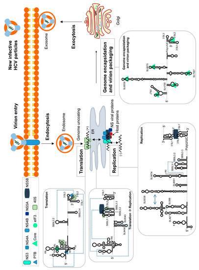 HCV replicates in the cytoplasm once viral protein levels are adequate. Actively translating viral RNA molecules must be transferred to the replication complexes, which contain non-structural viral proteins embedded in the endoplasmic reticulum. This supramolecular complex generates a membranous web that provides a suitable microenvironment for replication [108,109]. In the replication complexes, positive ssRNA acts as a template for the synthesis of the full length negative ssRNA intermediates required to generate the positive ssRNA genomes for use in new rounds of translation, replication and virion packaging. Since RNA replication has to initiate from the 3′- end of the RNA template, this region accumulates numerous functional domains that participate not only in translation (see above), but also in replication control.