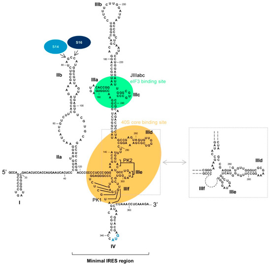 The HCV IRES element. Sequence and secondary structure of the 5′UTR in the HCV genome, including the minimal internal ribosome entry site (IRES). Domains involved in the interaction with eIF3 and the 40S ribosomal subunit are marked in green and orange respectively. Potential interaction sites of ribosomal proteins S14 and S16, depicted as blue ovals, are indicated with arrows. The translation start codon is revealed in enlarged blue lettering. An alternative folding state of subdomain IIId is shown, mediated by the slight displacement of five nucleotides that promotes a significant rearrangement at the base of domain III. PK, pseudoknot. Numbering corresponds to nucleotide positions of HCV Con1 isolate, genotype 1b.