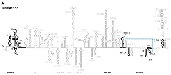 The viral RNA genome is clearly a versatile device. Throughout the genome, structurally preserved RNA domains form groups of functional and regulatory active regions that play important roles in the execution of the infective cycle [20,21,22]. The search for these structural and functional domains has spanned two decades. By using high-throughput techniques, classical biochemical methodologies, viral genetics techniques, comparative sequence analyses and bioinformatics strategies, different groups have provided important information on a large set of structural domains (Figure 1B) [20,21,22,23].