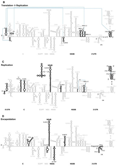 The NS4B coding region also contains tools for the control of RNA replication (see Figure 2 and Figure 4C) [22]. For example, a functional domain named SL6038 has been described which can adopt two conformations: a cloverleaf-like structure that activates viral RNA synthesis, and a stem-loop isoform that interferes with the replication [22]. Similarly, stem-loop SL8001 in the NS5B coding region has been proposed to be a replication control device via its mediating conformational tuning events.