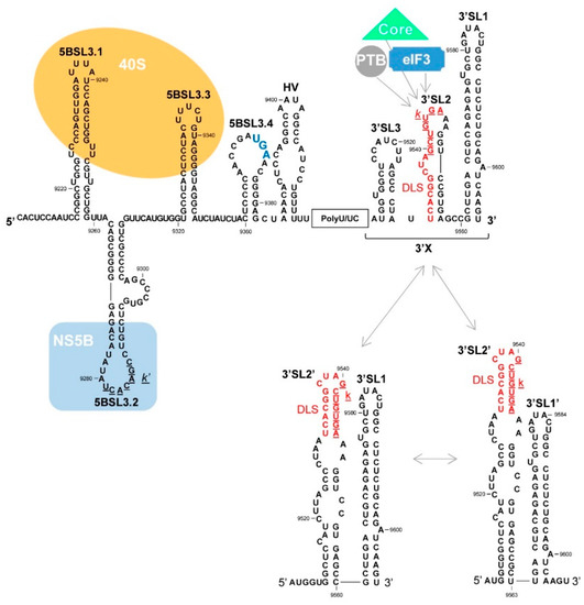 - Romero-López, C.; Berzal-Herranz, A. The functional RNA domain 5BSL3.2 within the NS5B coding sequence influences hepatitis C virus IRES-mediated translation. Cell Mol. Life Sci. 2012, 69, 103–113. [Google Scholar] [CrossRef] [PubMed]